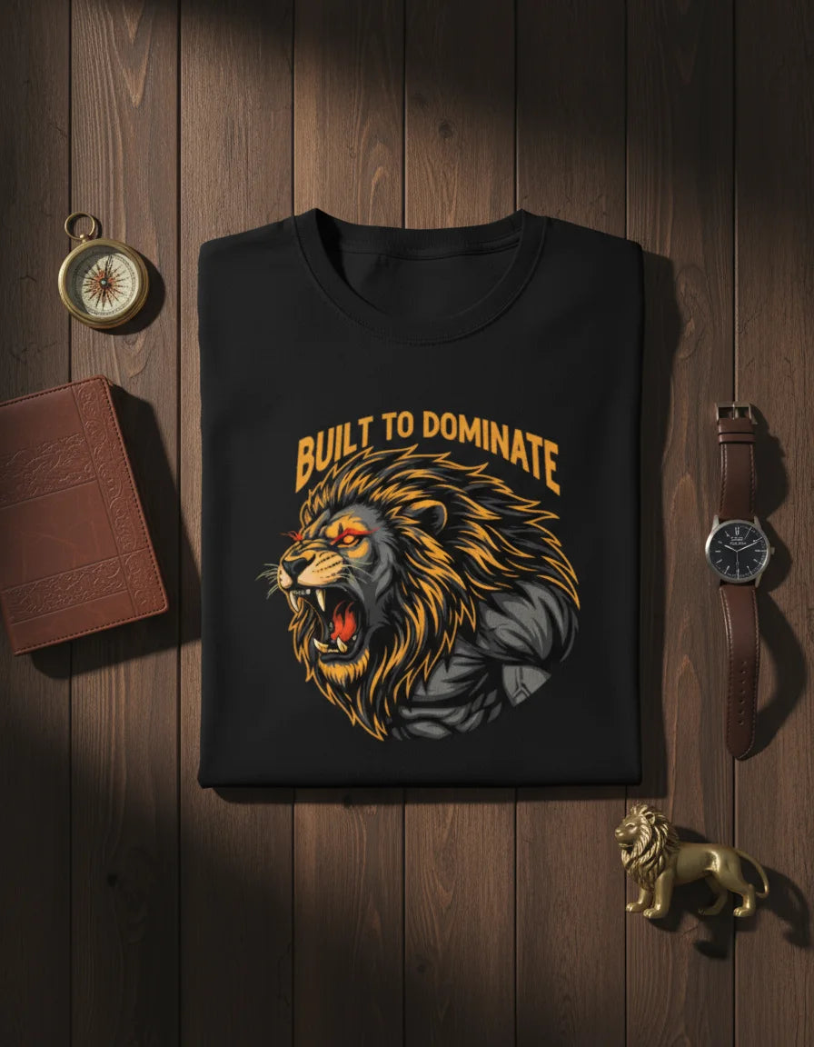 Men’s “Built to Dominate” Lion Graphic Gym & Casual T-Shirt Basic T-Shirt