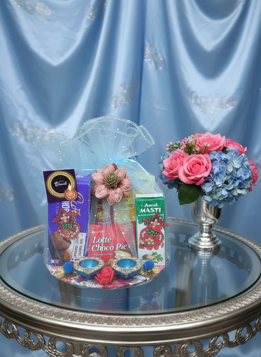 Celebrate the joy of Diwali with our budget-friendly festive hamper curated with love and warmth. Packed with premium chocolates, traditional snacks, refreshing drinks, and decorative festive products, this hamper is the perfect blend of tradition and indulgence. Beautifully wrapped with festive décor, it makes an ideal Diwali gift for family, friends, employees, or clients. Can also be customised for other festivals.