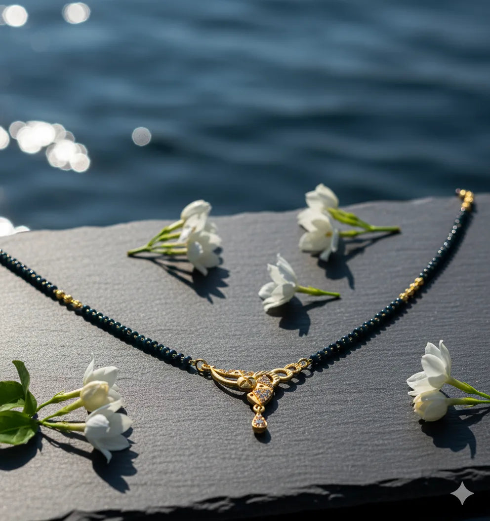 The pendant features a modern curved design embellished with sparkling cubic zirconia stones and a graceful teardrop dangler, perfectly complementing the traditional black-and-gold beaded chain. Lightweight and durable, this piece is ideal for daily wear while still being stylish enough for festive occasions.
