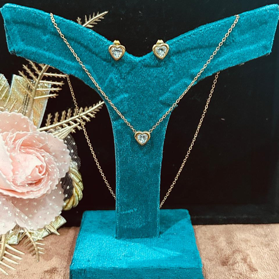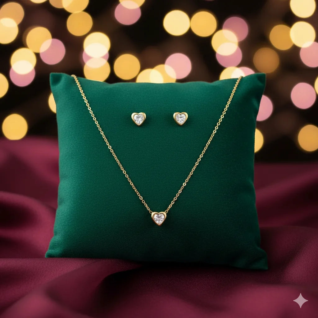 The set features a delicate heart-shaped pendant with a sparkling stone center, paired with matching stud earrings. Its minimal yet elegant design makes it perfect for daily wear or gifting to someone special.