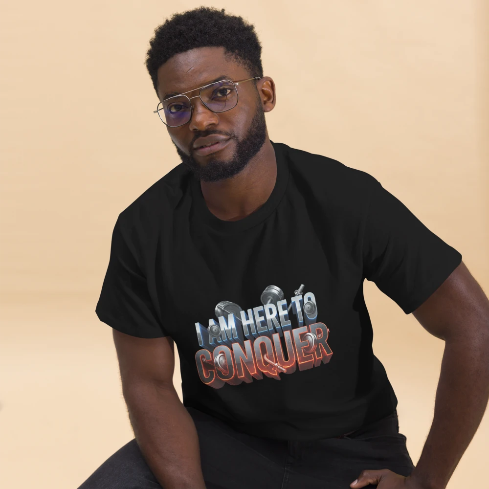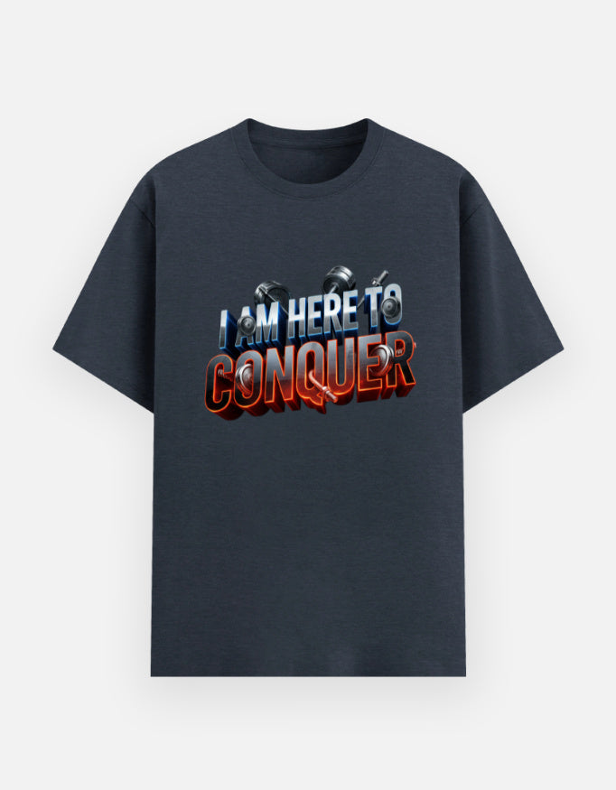 The bold fitness-inspired graphic design with the powerful quote “I Am Here to Conquer” makes it the ultimate choice for gym enthusiasts, athletes, and streetwear lovers. Its relaxed unisex fit ensures effortless movement, making it equally perfect for workouts, casual outings, or layering with your favorite look.