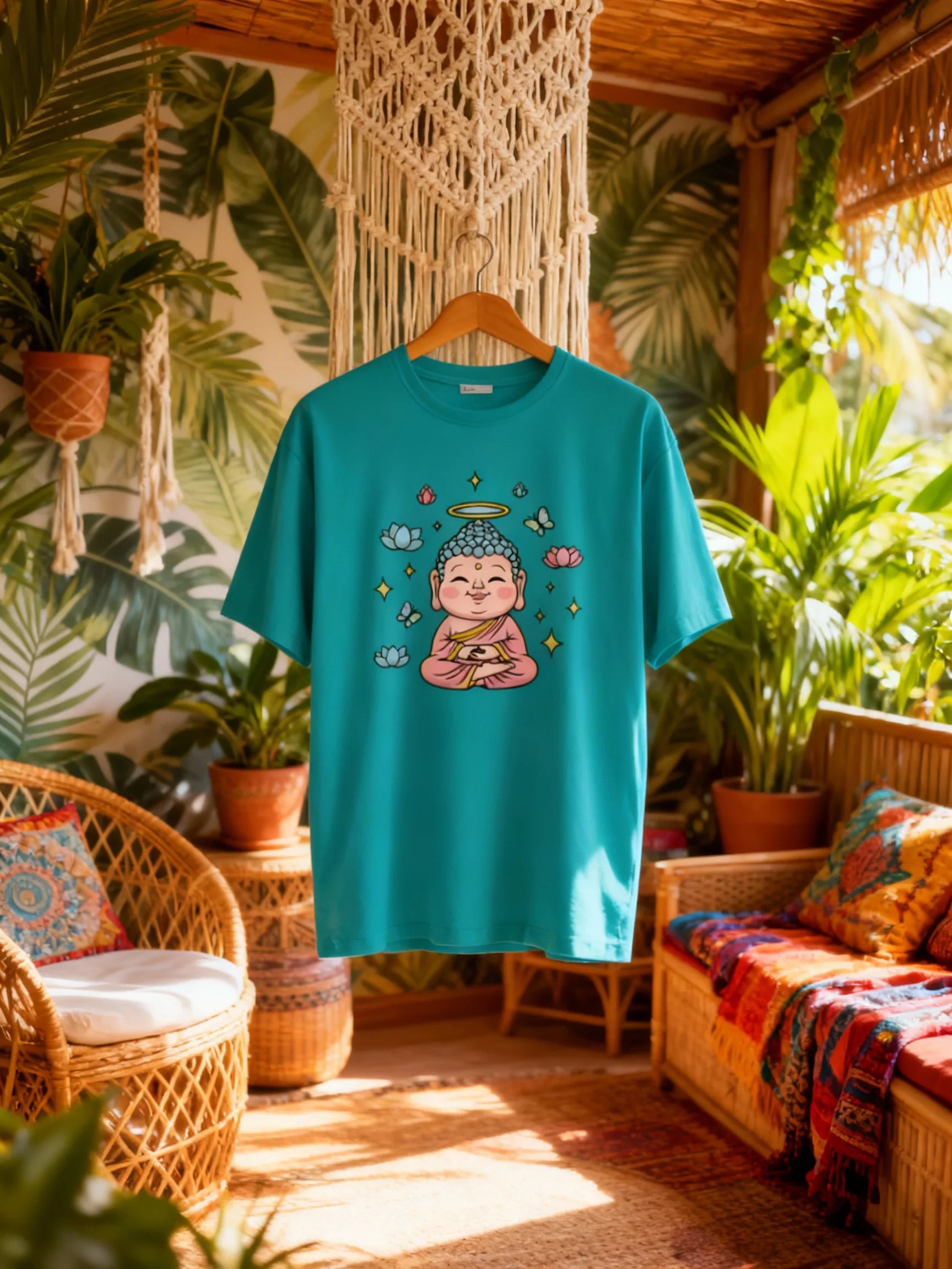 Design: Buddha and peace–inspired graphic for a mindful and stylish look.
