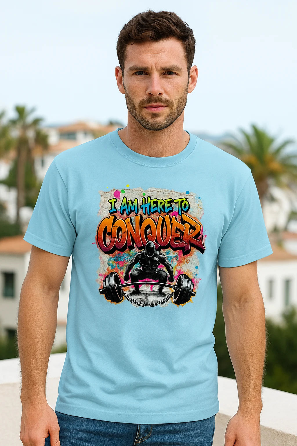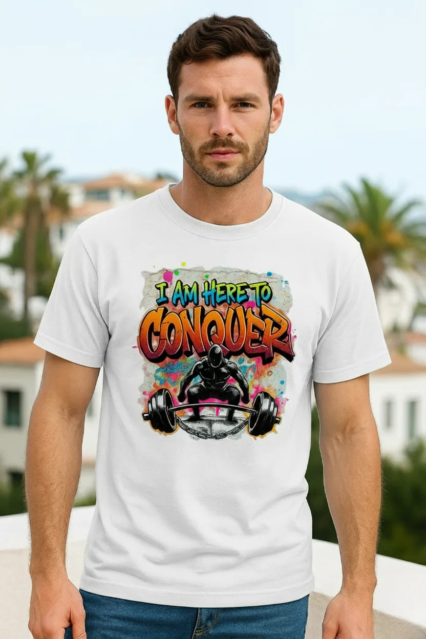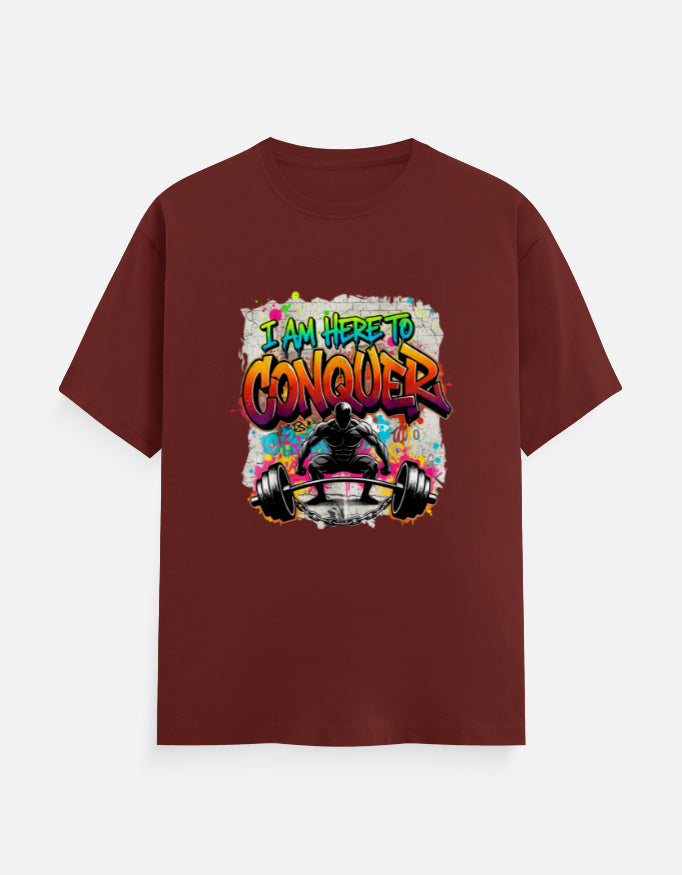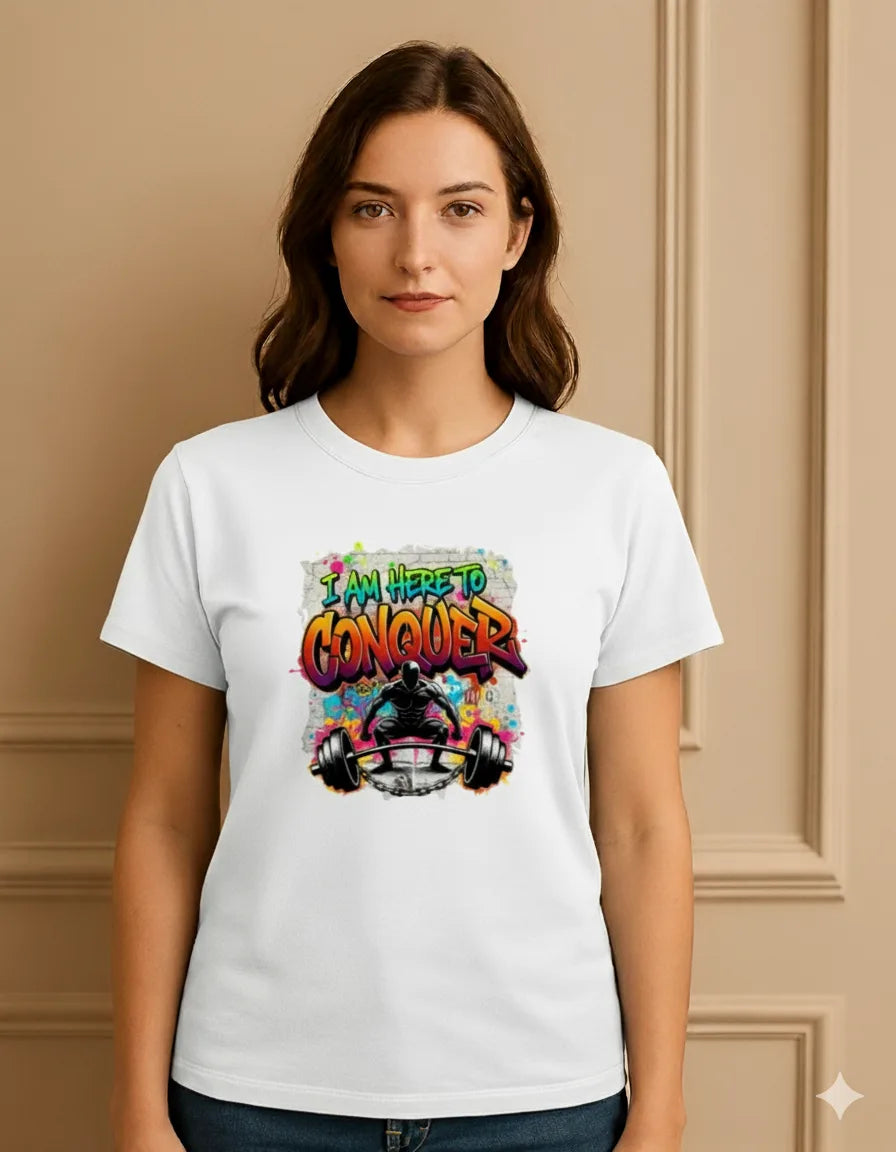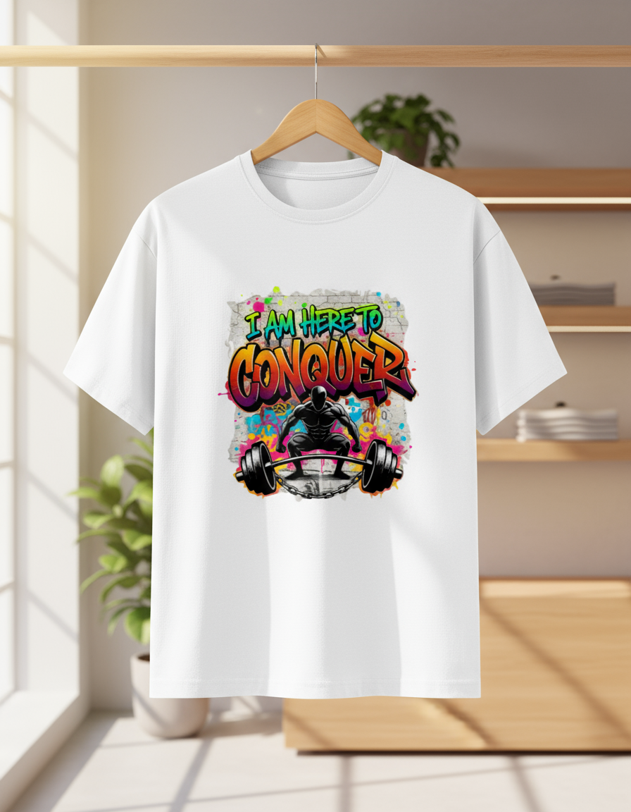 The bold graffiti-inspired design with the powerful quote “I Am Here to Conquer” reflects strength, resilience, and determination – perfect for gym lovers, athletes, and streetwear fans. With its regular unisex fit, this tee is designed to suit every body type while keeping you comfortable and stylish all day long.