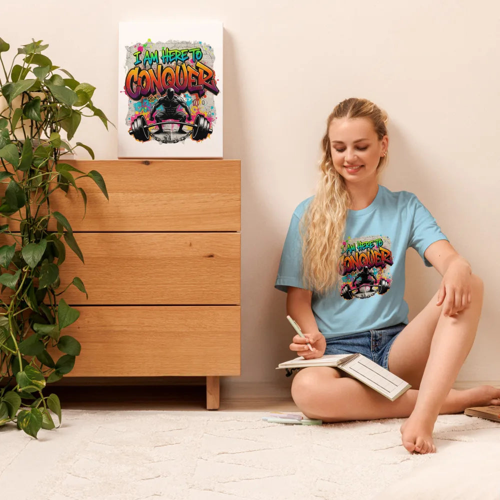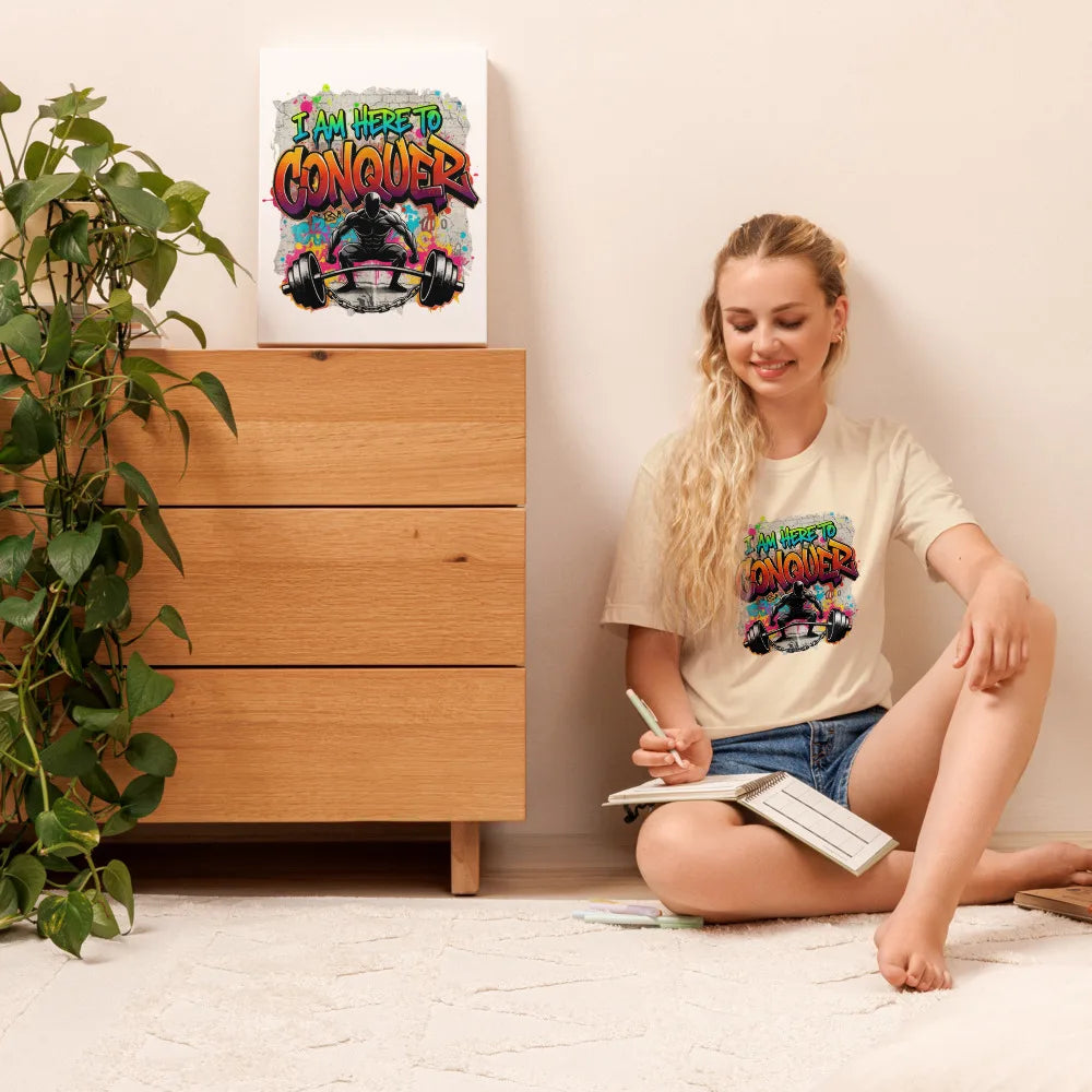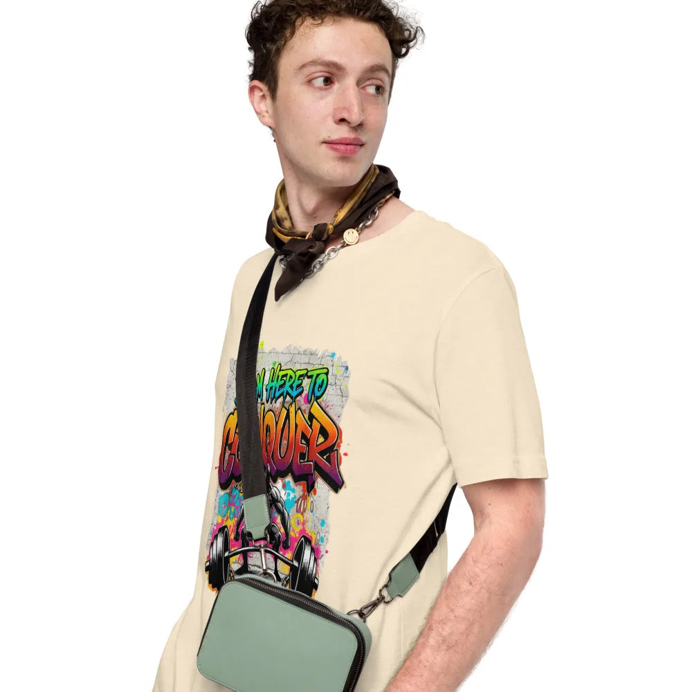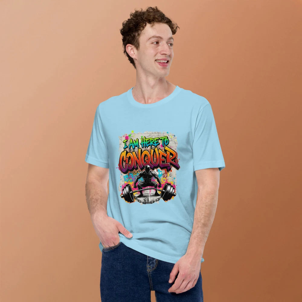 The bold graffiti-inspired design with the powerful quote “I Am Here to Conquer” reflects strength, resilience, and determination – perfect for gym lovers, athletes, and streetwear fans. With its regular unisex fit, this tee is designed to suit every body type while keeping you comfortable and stylish all day long.